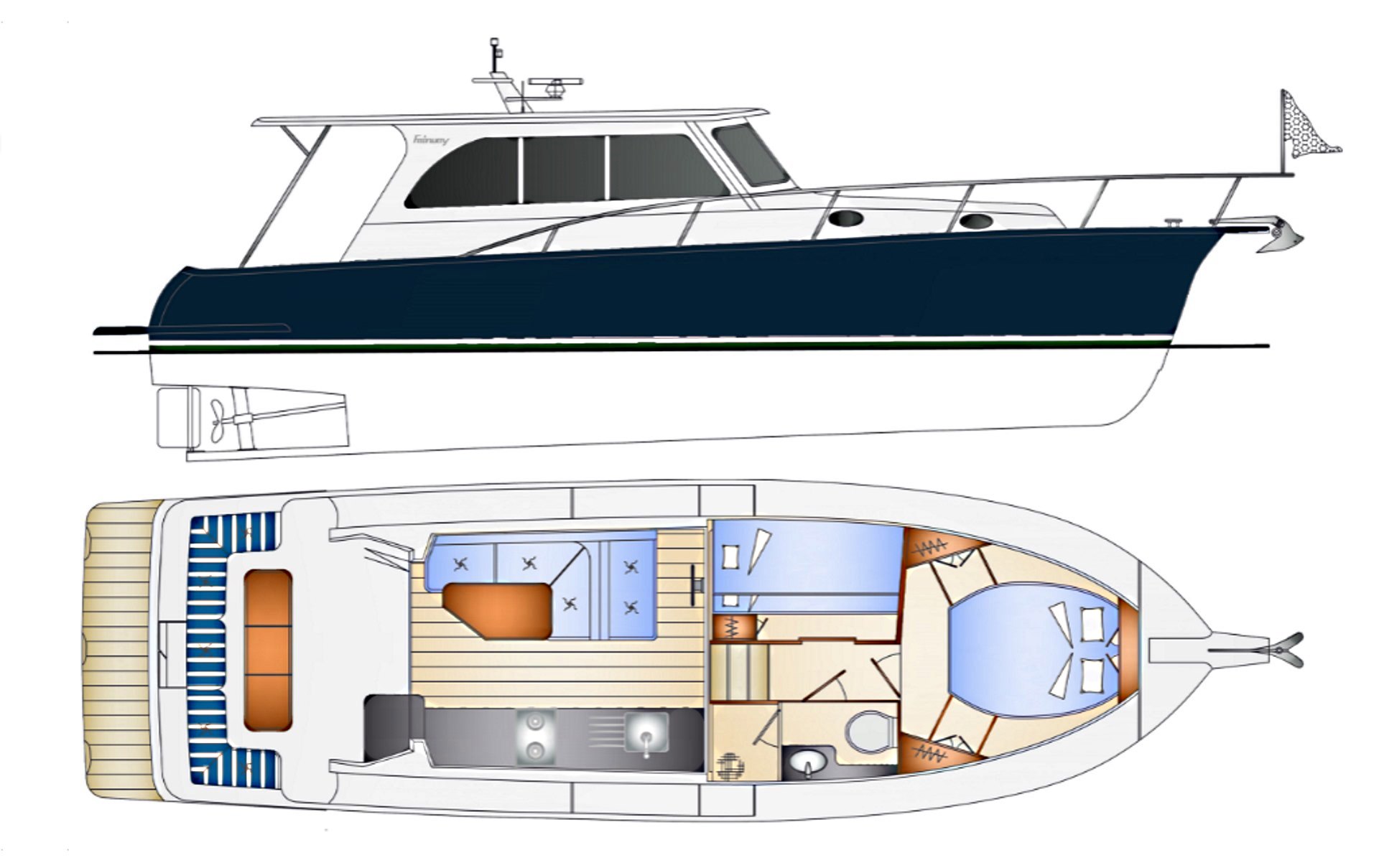 This All New model is based on the well respected and extremely popular Fairway 36. The hull is unchanged except for the addition of around 300 mm to the stern which will enhance the planning ability and buoyancy in the stern.